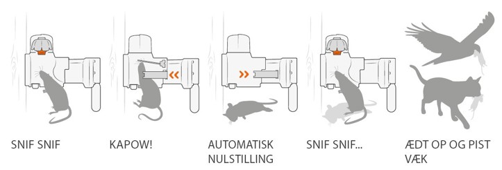 3. Skadedyret bliver dræbt øjeblikkeligt, så det ikke lider, og fælden nulstiller sig selv automatisk.