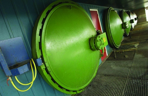 - Først anbringes de fortørrede træpæle i en stor kedel, der virker som en trykbeholder. Kedlen lukkes helt tæt, og der skabes et vakuum. Fugten slipper ud af træet - lidt ligesom en svamp, der presses sammen.
